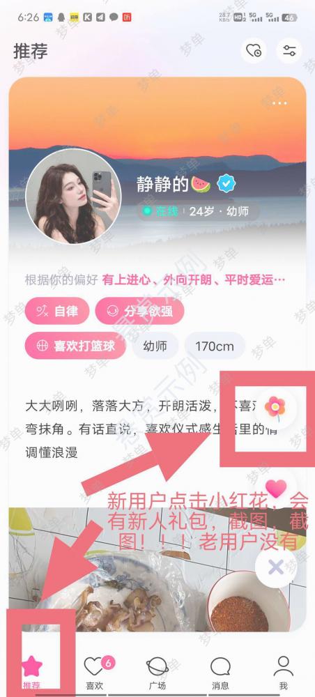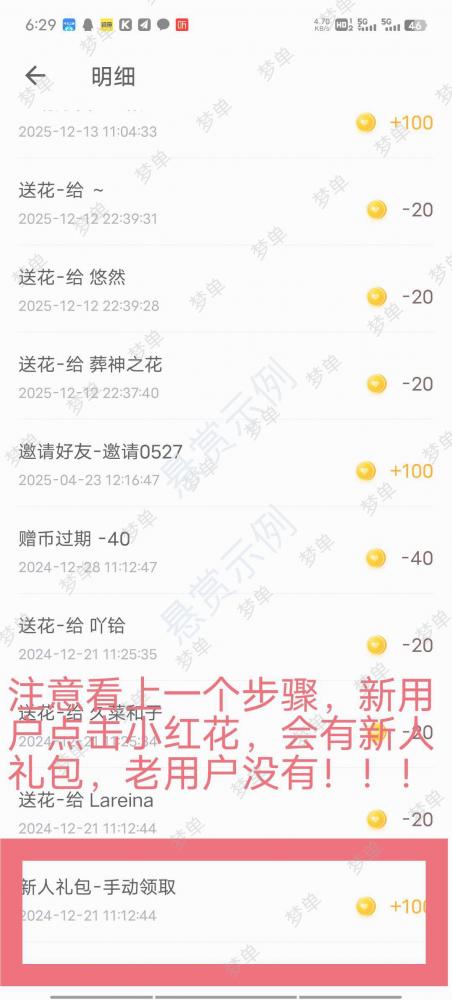 (所有截图可以最后截!!!注册中途不能退出和切屏)点击推荐,在送出小红花,会出现新人礼包,领取。老用户没有,中途退出或者切屏的也没有!