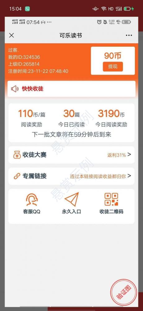 阅读30篇文章截图,2秒一篇,可以自提0.3,上级id必须是4195493二维码上面就有邀请人的ID。邀请人不是我不要乱提交
